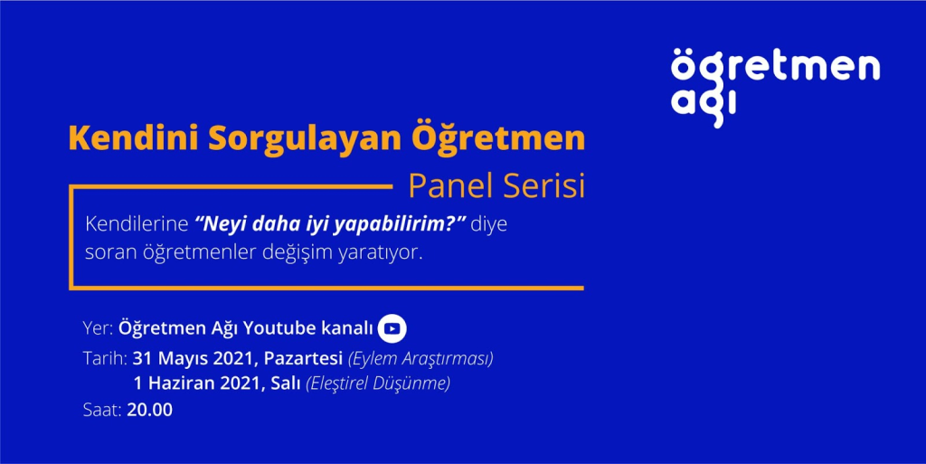 Serinin ilk paneli “Eylem Araştırması” alt başlığı ile, İstanbul Bilgi Üniversitesi Sosyoloji ve Eğitim Çalışmaları Merkezi (SEÇBİR) Proje Uzmanı Melike Ergün’ün moderasyonunda, Öğretmen Ağı Değişim Elçileri Evrim Yurtseven, Fisun Aykır ve Mine Aksar’ın katılımı ile gerçekleşecek. 31 Mayıs Pazartesi günü saat 20.00-21.00 arasında, Öğretmen Ağı Youtube kanalından yayınlanacak.