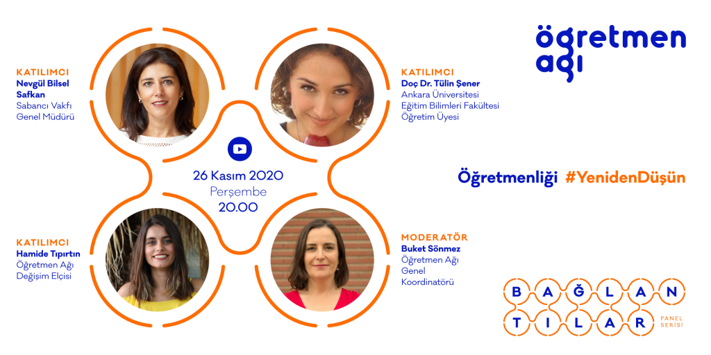 “Eğitimi Yeniden Düşün” başlığıyla düzenlenecek olan Bağlantılar’ın ilk bölümü, Öğretmenliği #YenidenDüşün başlığıyla 26 Kasım Perşembe günü saat 20.00’de Öğretmen Ağı Youtube kanalından yayınlanacak. Bölüm, Sabancı Vakfı Genel Müdürü Nevgül Bilsel Safkan, Değişim Elçisi Hamide Tıpırtın, Ankara Üniversitesi Eğitim Bilimleri Fakültesi Öğretim Görevlisi Doç. Dr. Tülin Şener’i konuşmacı olarak ağırlayacak. Bölümün moderasyonunu, Öğretmen Ağı Genel Koordinatörü Buket Sönmez üstlenecek.