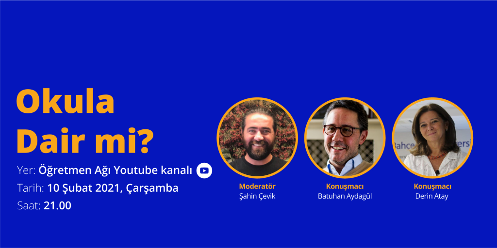 10 Şubat Çarşamba günü Öğretmen Ağı YouTube hesabından 21:00’da yayınlanacak, Karşılaşmalar serisinin yenisi “Okula Dair mi?”, The University of Wisconsin Madison Doktora Öğrencisi ve Öğretmen Ağı Danışmanı Batuhan Aydagül ve Bahçeşehir Üniversitesi Eğitim Fakültesi Dekanı Derin Atay’ı konuşmacı olarak ağırlayacak. Yayının modersyonunu, Öğretmen Ağı Değişim Elçisi ve eğitimci Şahin Çevik üstlenecek.