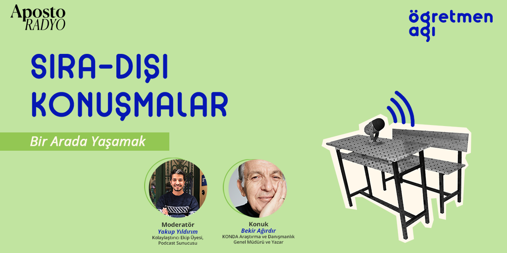 4 Nisan 2023 tarihinde Aposto Radyo’da yayınlanan bölümde konumuz, Eğitimin toplumsal ilişkiler üzerindeki etkisi ve bir arada yaşamla ilişkisi. Konuğumuz ise KONDA Araştırma ve Danışmanlık Genel Müdürü ve Yazar Bekir Ağırdır. Sohbetin moderasyonu için mikrofon başında Öğretmen Ağı Kolaylaştırıcı Ekip Üyesi ve Podcast Sunucusu Yakup Yıldırım bulunuyor.