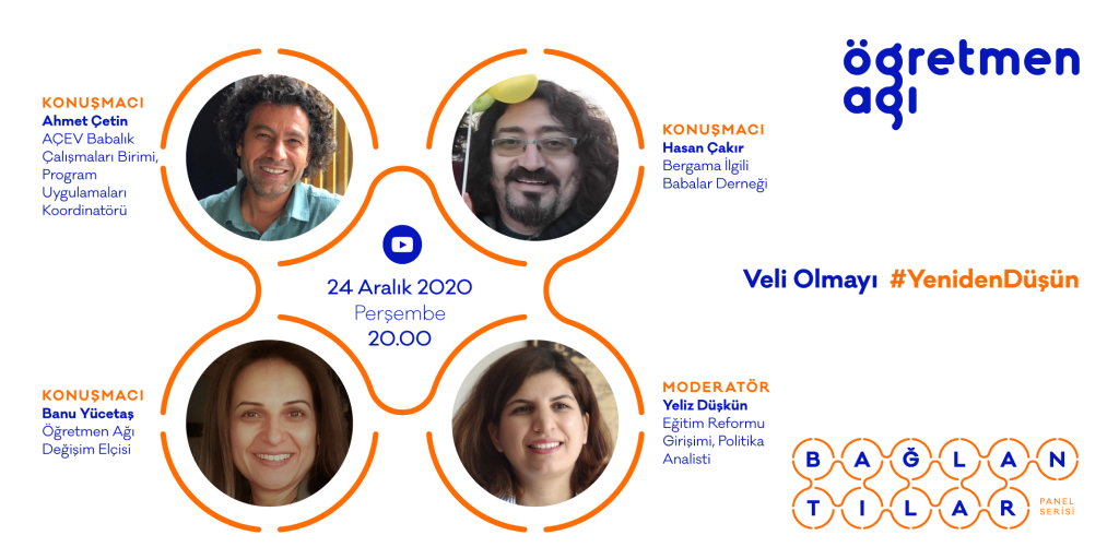 Değişim Elçileri tarafından yayınlanan manifestoyla duyurulan “Bağlantılar” isimli çevrimiçi panel serisinin üçüncü bölümü, Veli Olmayı #YenidenDüşün 24 Aralık’ta Öğretmen Ağı Youtube kanalında yayınlanacak.