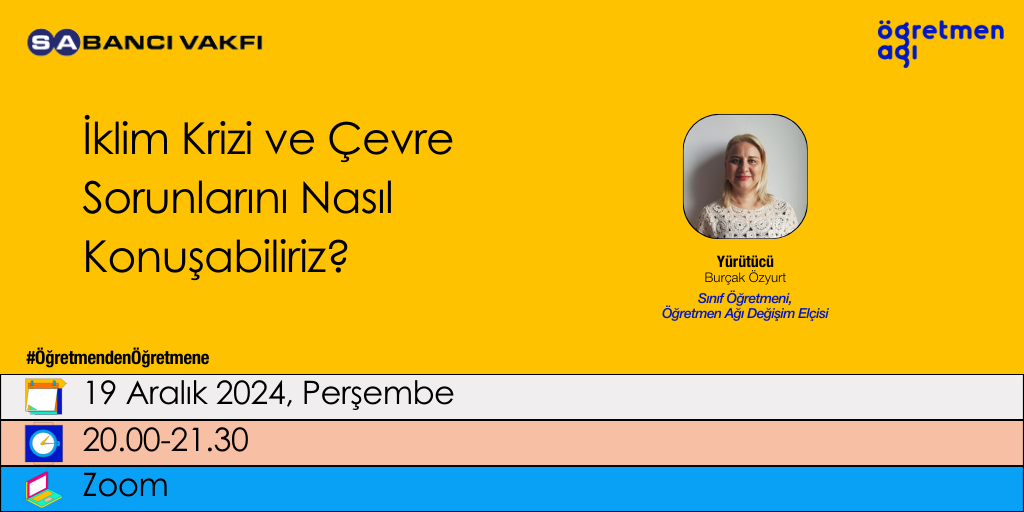 Aralık 19, 2024Saat: 20:00-21:30 Sabancı Vakfı İşbirliğiyle: 19 Aralık Perşembe günü 20:00-21:30 saatleri arasında Zoom üzerinden çevrimiçi olarak gerçekleşecek “İklim Krizi ve Çevre Sorunlarını Nasıl Konuşabiliriz?” etkinliğine davetlisiniz!İnsanın doğa üzerinde yarattığı baskı ve kurduğu tahakküm, çevre sorunlarının artmasına ve başta iklim krizi olmak üzere birçok krizin ortaya çıkmasına neden oldu. İnsanın merkezi rolünü sorgulayan ve yeryüzüyle uyum içinde nasıl…