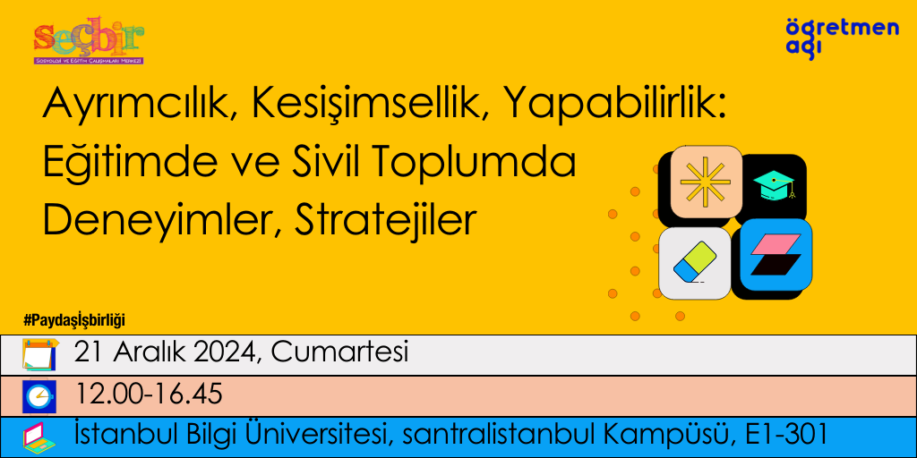 Aralık 21, 2024Saat: 12:00-17:00 21 Aralık Cumartesi günü 12.00-17.00 saatleri arasında İstanbul, İstanbul Bilgi Üniversitesi’nde yüz yüze olarak gerçekleşecek “Ayrımcılık, Kesişimsellik, Yapabilirlik: Eğitimde ve Sivil Toplumda Deneyimler, Stratejiler” sempozyumuna davetlisiniz!  Ayrımcılığı kesişimsellik kavramıyla ele almak, ayrımcılığın karmaşık ve çok katmanlı doğasını anlamak açısından önemlidir. Ayrımcılığı tek bir kimlik kategorisi üzerinden anlamaya çalışan…