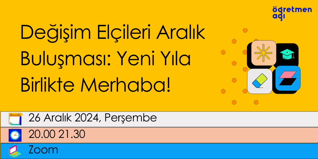 Aralık 26, 2024Saat: 20:00-21:30 Değişim Elçileri Aralık Buluşması 26 Aralık 20:00’da Zoom’da 🎉64 şehirden 877 Değişim Elçisi ile yeni yıl heyecanını paylaşmak, güzel dileklerimizi bir araya getirmek ve harika bir akşam geçirmek için 26 Aralık Perşembe akşamı saat 20:00’da Zoom’da buluşuyoruz!Bu özel buluşmada, yeni yıl ruhunu hep birlikte hissedeceğiz. Yılın yorgunluğunu atarken eğlenceli etkinliklerle ve sürprizlerle dolu bir akşamı paylaşacağız. 🎅🎄Katılmak çok kolay: Aşağıdaki…
