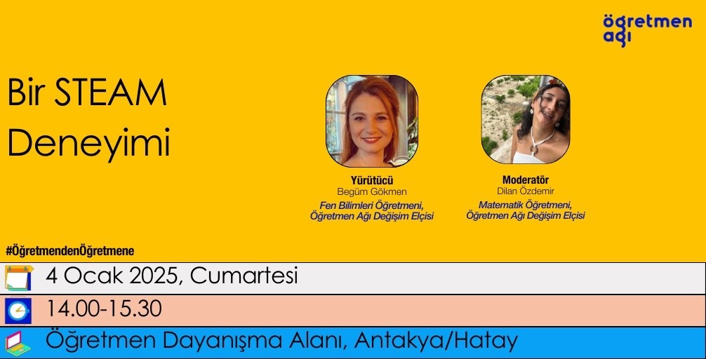 Ocak 4, 2025Saat: 14:00-15:30 4 Ocak Cumartesi günü 14:00-15:30 saatleri arasında Zoom’da çevrimiçi olarak gerçekleşecek Bir STEAM Deneyimi etkinliğine davetlisiniz!Fen bilimleri ve matematik derslerini zenginleştirmek, daha ilgi çekici hale getirmek ve 21. yüzyıl becerilerine sahip öğrenciler yetiştirmek için bir araya geliyoruz. Bu etkinlikte, STEAM nedir ve nasıl uygulanır sorularına odaklanacak, fen bilimleri derslerine entegre edilebilecek STEAM başlıklarını…
