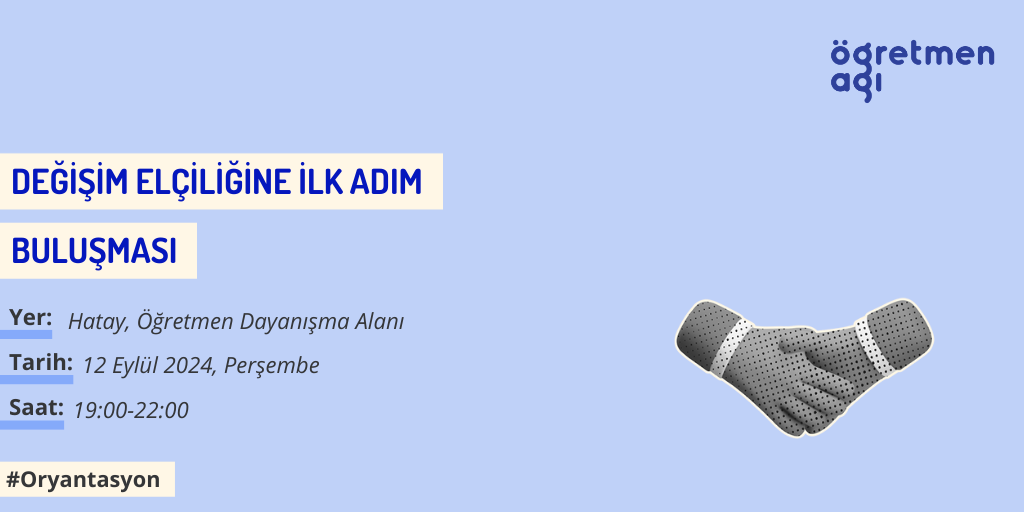 Eylül 12, 2024Saat: 19:00-22:00 Değişim Elçisi olmak isteyen öğretmenlere bir çağrımız var! 12 Eylül Perşembe günü 19:00-22:00 saatleri arasında Hatay, Öğretmen Dayanışma Alanı’nda yüz yüze olarak gerçekleşecek “Değişim Elçiliğine İlk Adım Buluşması’na” davetlisiniz!Öğretmen Ağı olarak peşinde olduğumuz değişim hedefini paylaşan ve Ağ ile yakın çalışan gönüllü öğretmenler, kısaca “Değişim Elçisi” olarak anılır. Değişim Elçisi öğretmenler, kendi mesleki ve kişisel…