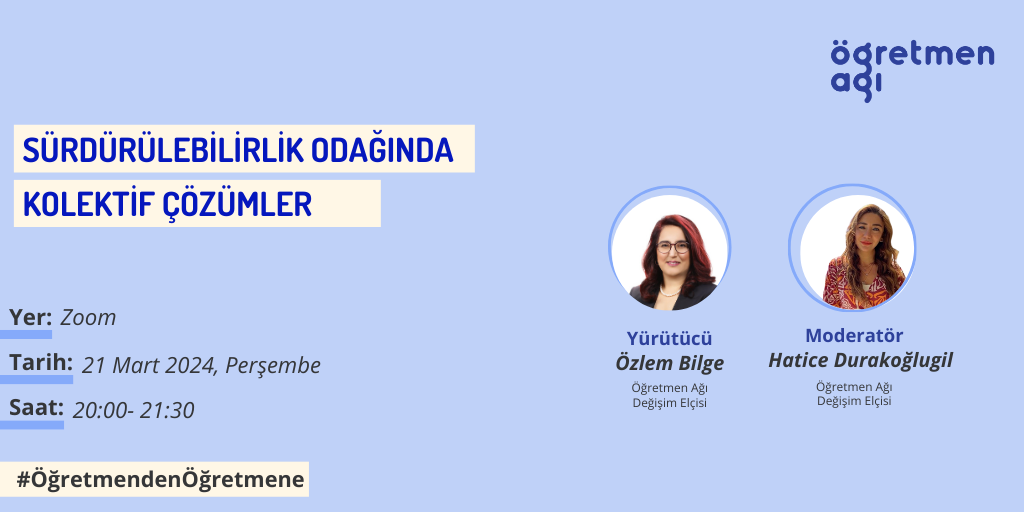 Mart 21, 2024Saat: 20:00-21:30 21 Mart Perşembe 20:00-21:30 saatleri arasında Zoom üzerinden çevrimiçi olarak gerçekleşecek, “Sürdürülebilirlik Odağında Kolektif Çözümler” etkinliğine davetlisiniz!Yaşadığımız dünyada çevresel sorunlar gün geçtikçe artıyor. Bu süreçte artık bireysel çabanın ötesinde toplumsal bir harekete ve çabaya ihtiyaç duyuyoruz. “Sürdürülebilirlik Odağında Kolektif Çözümler” atölyesinde, geleneksel düşünce kalıplarını zorlayarak “biz” anlayışına…