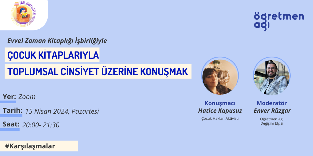 Nisan 15, 2024Saat: 20:00-21:30 Evvel Zaman Kitaplığı İşbirliğiyle:15 Nisan Pazartesi günü 20:00-21.30 saatleri arasında Zoom üzerinden çevrimiçi olarak gerçekleşecek “Çocuk Kitaplarıyla Toplumsal Cinsiyet Üzerine Konuşmak” etkinliğine davetlisiniz!Günlük hayatta karşılaştığımız birçok ayrımcılık çeşidinden biri olan toplumsal cinsiyet temelli ayrımcılık kendisini küçük yaşlarda kabullendiğimiz cinsiyet rolleri ve kalıplarıyla gösteriyor. Oysa ki…