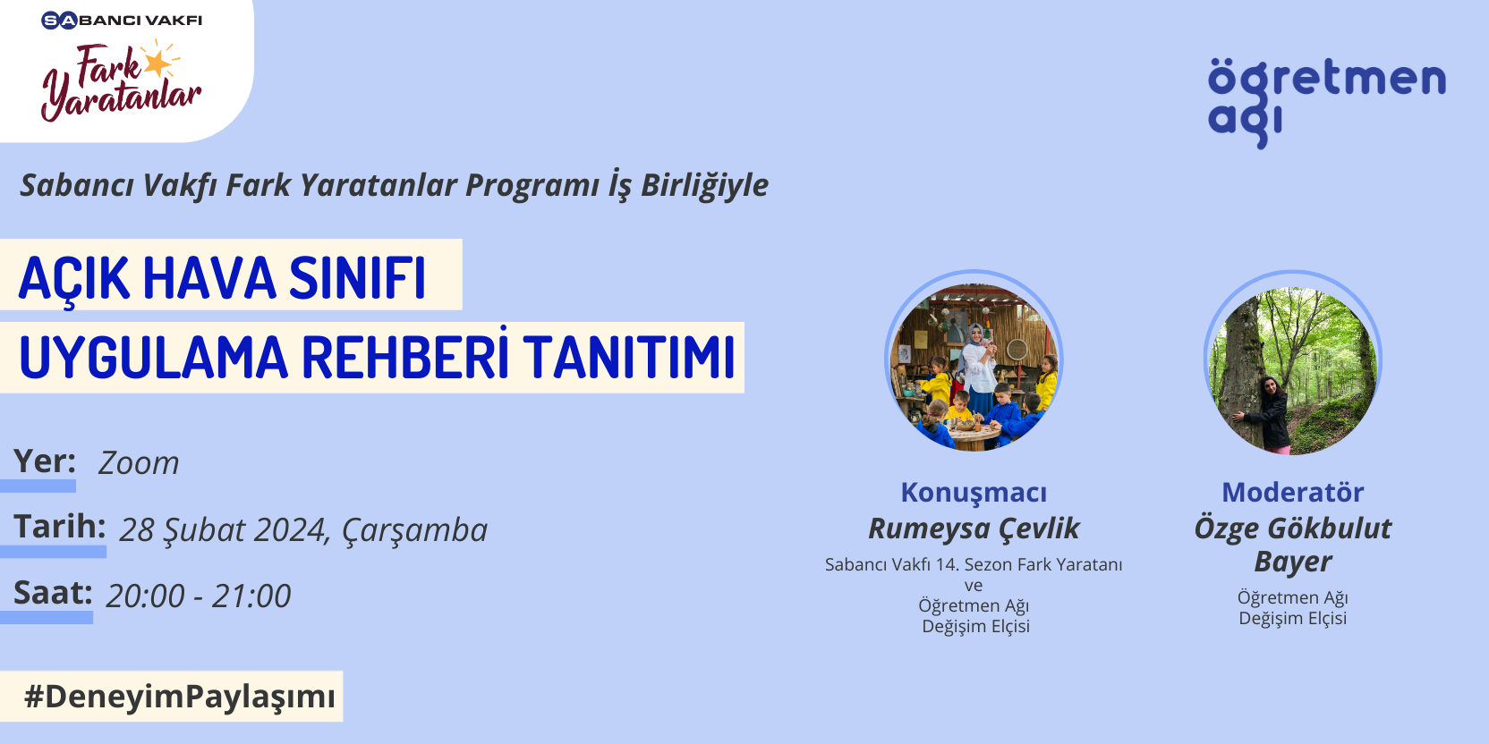 Şubat 28, 2024Saat: 20:00-21:00 28 Şubat Çarşamba günü 20:00-21:00 saatleri arasında Zoom üzerinden çevrimiçi olarak gerçekleşecek “Açık Hava Sınıfı Uygulama Rehberi Tanıtımı” etkinliğine davetlisiniz! Sabancı Vakfı Fark Yaratanlar Programı 14. Sezon Fark Yaratanlarından Değişim Elçisi Rumeysa Çevlik, Osmaniye’nin Kadirli ilçesinde okul öncesi öğretmeni olarak çalışmalarını sürdürüyor. Çocukların hem fiziksel hem ruhsal sağlığı açısından açık havada vakit…