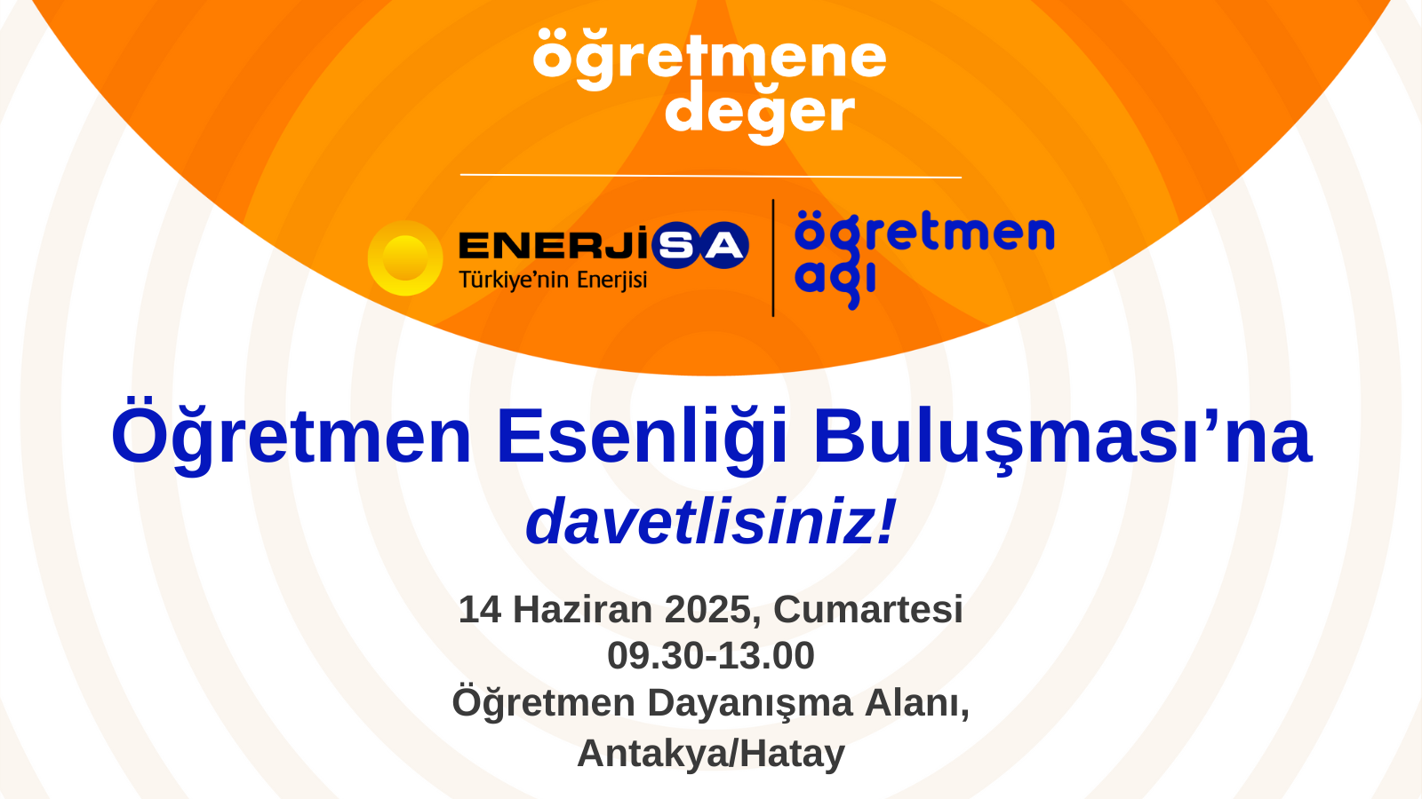 Haziran 14, 2025Saat: 13:30-17:30 14 Haziran Cumartesi günü 13:30-17:30 saatleri arasında Enerjisa Enerji işbirliğiyle gerçekleşen Öğretmene Değer projesi kapsamında Hatay, Öğretmen Dayanışma Alanı’nda gerçekleşecek Öğretmen Esenliği Buluşması’na davetlisiniz!Bireysel iyilik hâlinden okul iklimine, topluluk olmanın gücünden iyi örneklerin paylaşımına birçok konunun yer alacağı Öğretmen Esenliği Buluşması’nda; birlikte düşünecek, birlikte hissedecek, birlikte derin bir nefes alacağız.…