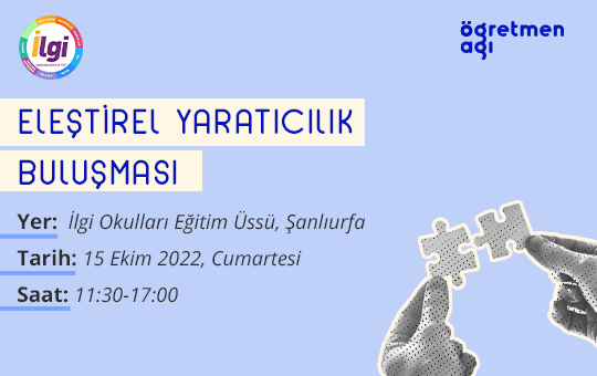 Ekim 15, 2022Saat: 11:30-17:00 Eleştirel düşünme ve yaratıcılık üzerine düşünüyor ve yeni yöntemler öğrenmek için heyecan duyuyor musunuz? O halde 15 Ekim 2022, Cumartesi günü, 11:30-17:00 saatleri arasında İlgi Okulları Eğitim Üssü, Şanlıurfa’da gerçekleştireceğimiz Eleştirel Yaratıcılık Buluşması’nda buluşalım! Öğretmen Ağı; öğretmenlerin, meslektaşları ve farklı disiplinlerden kişi ve kurumlarla bir araya gelerek güçlendiği bir paylaşım ve işbirliği ağı. Ağ’da…