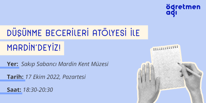 Ekim 17, 2022Saat: 18:30-20:30 Eleştirel düşünme ve yaratıcılık üzerine düşünüyor ve yeni yöntemler öğrenmek için heyecan duyuyor musunuz? O halde 17 Ekim 2022, Pazartesi günü, 18:30-20:30 saatleri arasında Sakıp Sabancı Mardin Kent Müzesi’nde gerçekleştireceğimiz Düşünme Becerileri Atölyesi’nde buluşalım! Öğretmen Ağı; öğretmenlerin, meslektaşları ve farklı disiplinlerden kişi ve kurumlarla bir araya gelerek güçlendiği bir paylaşım ve işbirliği ağı. Ağ’da ezberlerin…