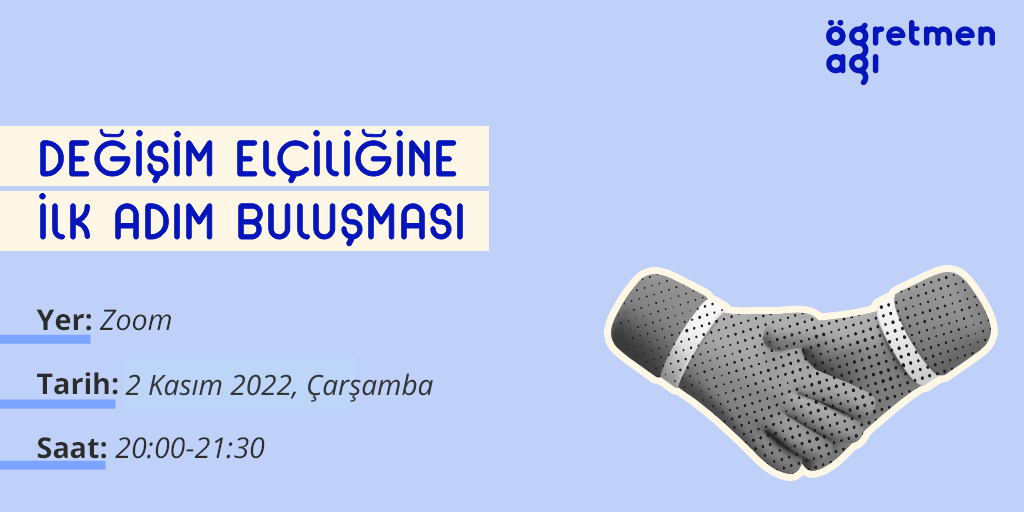 Kasım 2, 2022Saat: 20:00-21:30 Değişim Elçisi olmak isteyen öğretmenlere bir çağrımız var. Öğretmen Ağı olarak peşinde olduğumuz değişim hedefini paylaşan ve Ağ ile yakın çalışan gönüllü öğretmenler, kısaca “Değişim Elçisi” olarak anılır. Değişim Elçisi öğretmenler, kendi mesleki ve kişisel güçlenme yolculuklarına devam etmek için meslektaşlarıyla deneyimlerini paylaşır, ihtiyaç duydukları kişi ve kurumlarla tanışır, işbirlikleri geliştirir, 'adhokratik' topluluklar oluşturur. Yetkinliğini…