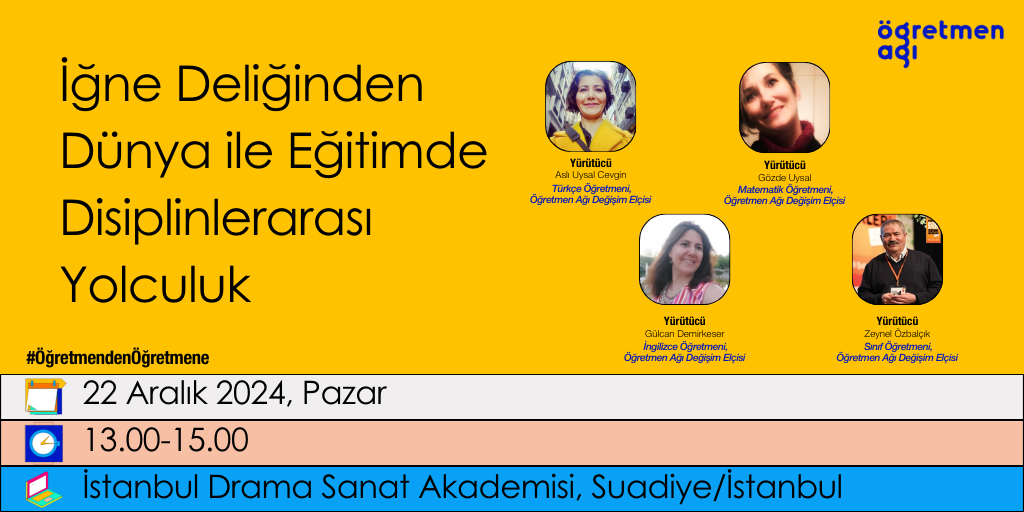 Aralık 22, 2024Saat: 13:00-15:00 22 Aralık Pazar günü 13:00-15:00 saatleri arasında İstanbul Drama Sanat Akademisi’nde yüz yüze gerçekleşecek İğne Deliğinden Dünya kitabının disiplinler arası yaklaşımı ve yaratıcı drama teknikleriyle zenginleştirilmiş atölyesine davetlisiniz!Öğretmen Ağı Değişim Elçileri Aslı Uysal Cevgin'in, H.Gözde Uysal'ın, Gülcan Demirkeser'in ve Zeynel Özbalçık'ın yürütücü olacağı bu etkinlikte; kapsayıcılık, yaratıcı düşünce ve eğitsel içerik geliştirme…