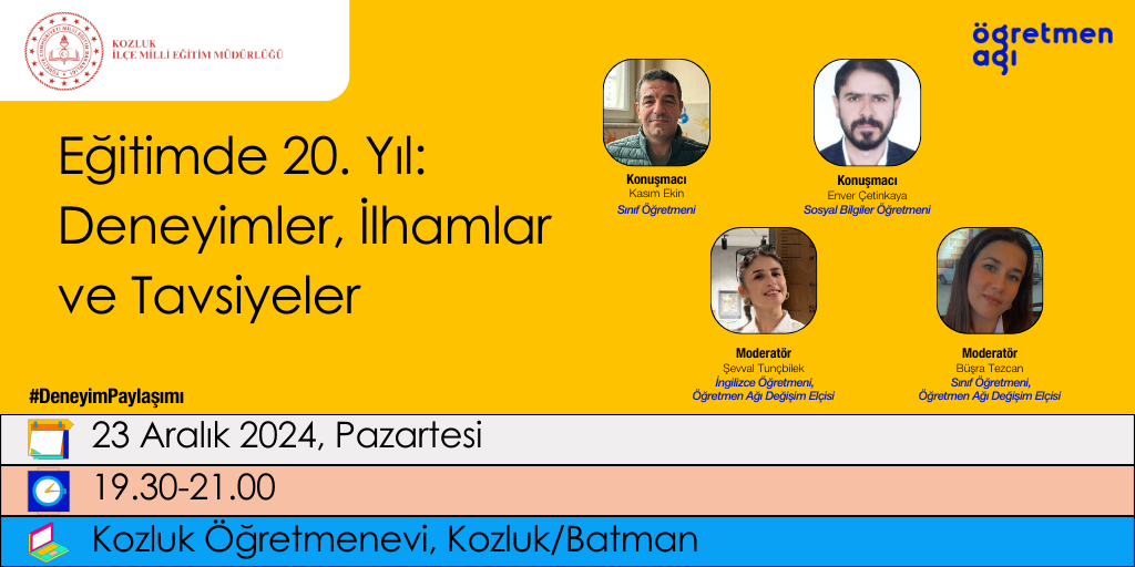 Aralık 23, 2024Saat: 19:30-21:00 23 Aralık Pazartesi günü 19:30-21:00 saatleri arasında Kozluk Öğretmenevi’nde gerçekleşecek Eğitimde 20 Yıl: Deneyimler, İlhamlar ve Tavsiyeler etkinliğine davetlisiniz! Öğretmen Ağı Değişim Elçileri Şevval Tunçbilek ve Büşra Tezcan’ın moderatör olarak yer olacağı etkinlikte Sınıf Öğretmeni Kasım Ekin ve Sosyal Bilgiler Öğretmeni Enver Çetinkaya 20 yıllık meslek hayatlarında biriktirdikleri deneyimleri paylaşmak üzere öğretmenlerle…