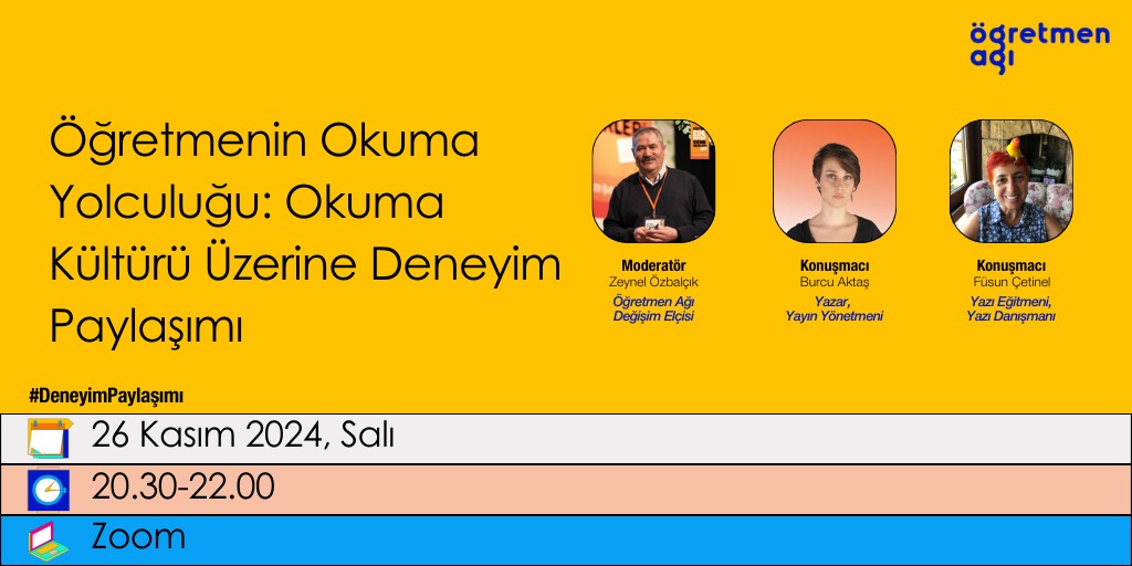 Kasım 26, 2024Saat: 20:30-22:00 26 Kasım Salı günü, 20:30-22:00 saatleri arasında Zoom üzerinden çevrimiçi olarak gerçekleşecek “Öğretmenin Okuma Yolculuğu: Okuma Kültürü Üzerine Deneyim Paylaşımı” etkinliğine davetlisiniz! Bir okuma kültürü geliştirmek, düşünme ve analiz etme yeteneklerini artırır, hayal gücünü besler ve kendimizi, çevremizi daha iyi anlamamızın ve empati göstermemizin kapılarını açar. Hayata hem daha yaratıcı hem de daha eleştirel bir bakış…