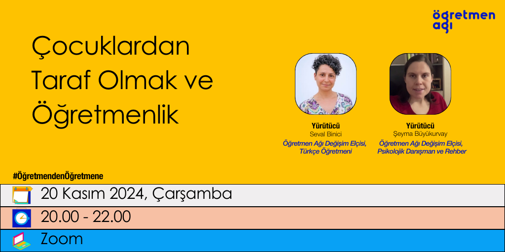 Kasım 18, 2024Saat: 20:00-21:30 18 Kasım 2024, Pazartesi günü 20:00-21:30 saatleri arasında Öğretmen Esenliği ve Sosyal Duygusal Öğrenme Topluluğu’nun ilk buluşmasına davetlisiniz! Öğretmen Ağı Değişim Elçileri Elif Kevser Seçkin Sarıaslan ve Burçak Özyurt bizleri öğretmen esenliği ve iyi olma halimiz üzerine birlikte düşünmeye davet ediyor.  Esenlik, fiziksel olduğu kadar psikolojik ve duygusal olarak da sağlıklı oluşumuzu tanımlayan ve kapsayan bir…