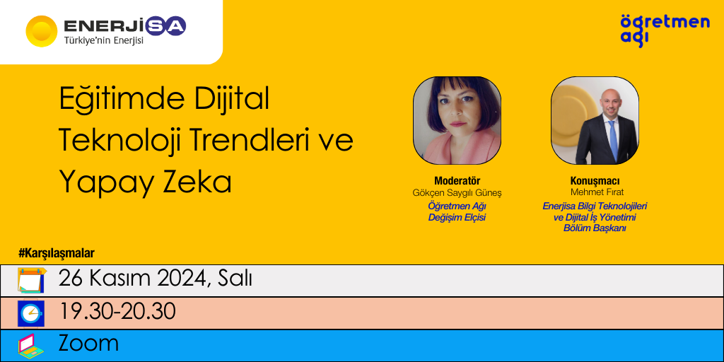 Kasım 26, 2024Saat: 19:30-20:30 EnerjiSA İşbirliğiyle:Öğretmen Ağı ve Enerjisa işbirliğinde gerçekleşen Öğretmene Değer projesinin ilk etkinliğinde buluşuyoruz! Proje kapsamında öğretmenlerin iyi olma hâline katkı sağlamak için adhokratik toplulukların çalışmalarını destekleyecek ve Ağ’a açık etkinlik içeriklerini besleyecek ve çeşitlendireceğiz. 26 Kasım Salı günü, 19.30-20.30 saatleri arasında Zoom üzerinden çevrimiçi olarak gerçekleşecek  “Eğitimde …