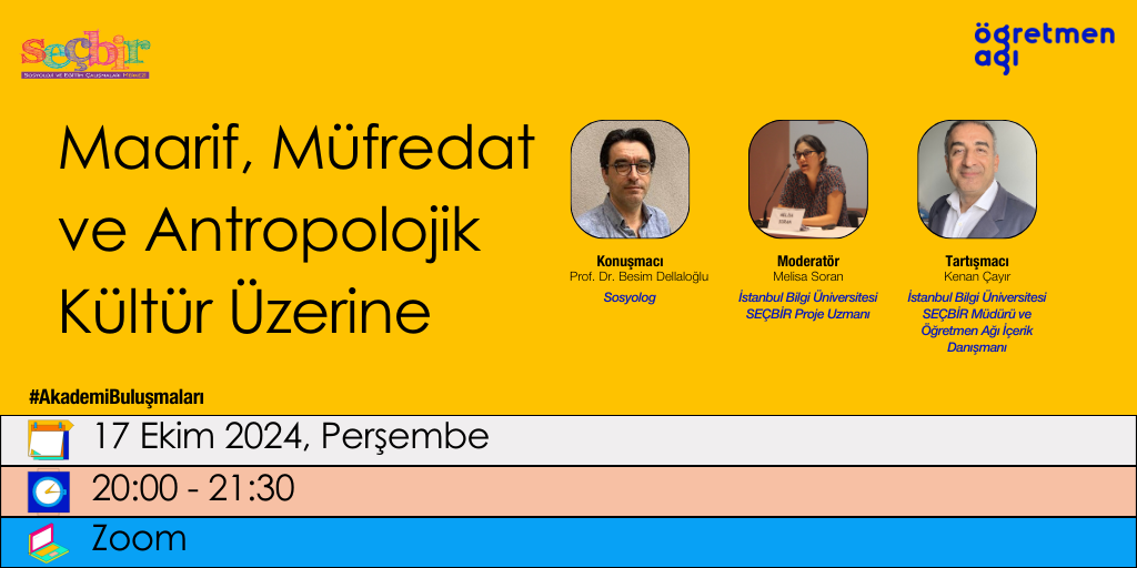 Ekim 17, 2024Saat: 20:00-21:30 SEÇBİR İşbirliğiyle: 17 Ekim Perşembe günü  20:00-21:30 saatleri arasında Zoom üzerinden çevrimiçi olarak gerçekleşecek “Maarif, Müfredat ve Antropolojik Kültür Üzerine” etkinliğine davetlisiniz! Yeni Maarif Modeli’nin açıklanması ve uygulanmaya başlanması kamuoyunda yoğun tartışmalara yol açtı. Ancak bu tartışmalar çoğunlukla sosyal medyada ve Türkiye’nin keskin ideolojik hatları üzerinden yapılıyor. Sonuçta eğitim, kültür,…