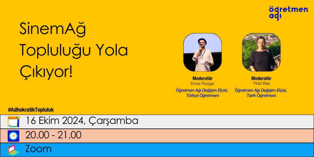Ekim 16, 2024Saat: 20:00-21:00 16 Ekim 2024, Çarşamba günü 20:00-21:00 saatleri arasında SinemAğ Topluluğu’nun ilk buluşmasına davetlisiniz! Öğretmen Ağı Değişim Elçileri Enver Rüzgar ve Yıldız Baş ile sinema üzerine konuşacağımız bir yolculuğa hazır mıyız?  Film izlemeyi kim sevmez ki! Sinema, bize sadece keyifli vakit geçirme imkanı sunan bir sanattan daha fazlası değil mi? Bizce öyle. Film izlemek, kurgusal bir hikayenin parçası olduğumuz o…