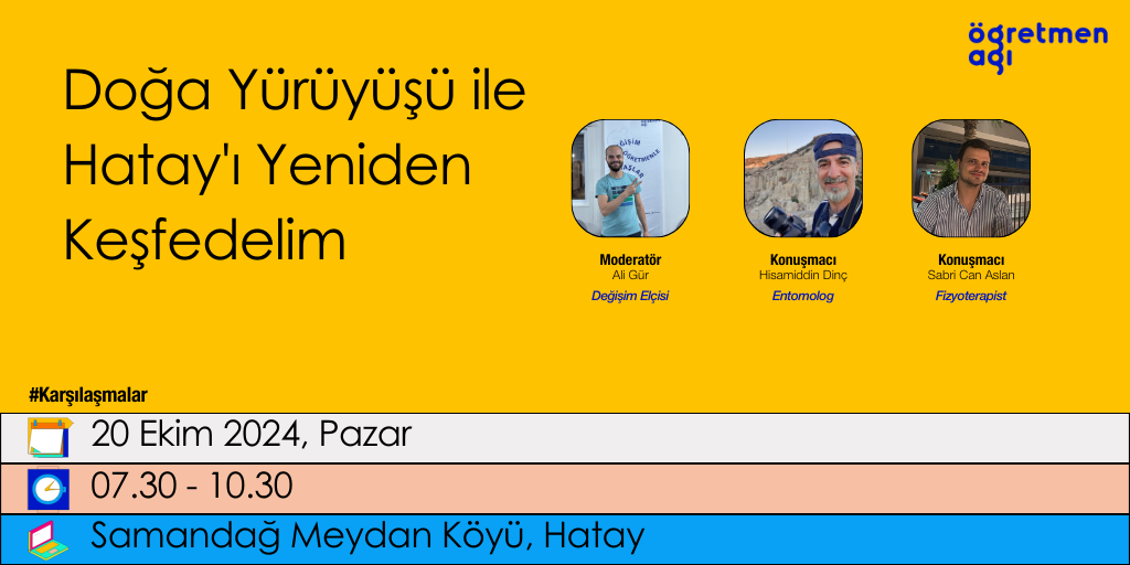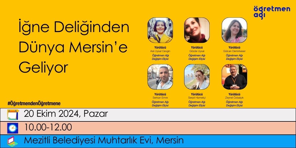 Ekim 20, 2024Saat: 10:00-12:00 20 Ekim Pazar günü, İğne Deliğinden Dünya atölyesi için Mersin’de, Mezitli Belediyesi Muhtarlık Evi’nde buluşalım!Disiplinlerarası, kapsayıcı ve erişilebilir ders içerikleri planlamak, bunu yaparken toplumsal cinsiyet eşitliğini, dayanışmayı, dostluk ilişkisini, doğayla saygılı bir bağ oluşturmayı, sorumluluk bilincini vurgulamak ilginizi çekiyor mu? O halde hikayesi, öğretmenler tarafından yazılan İğne Deliğinden Dünya kitabı yazarlarından 6 öğretmenin Hatay…
