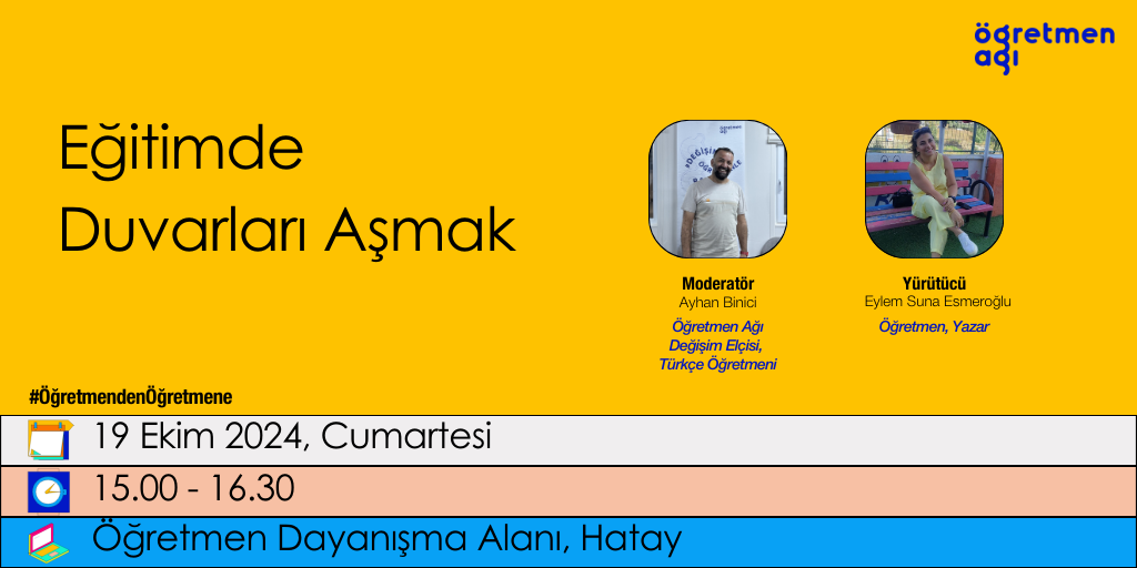 Ekim 21, 2024Saat: 19:30-20:30 Yaratıcı Özgüven Festivali Çalışma Topluluğu Başlıyor! Öğretmen Ağı Kolaylaştırıcı Ekibi, Değişim Elçileri ve Öğretmen Ağı paydaşlarıyla “Yaratıcı Özgüven” kavramını sahiplenmek, değişime ve yaratıcılığa olan inancı artırmak için bir araya geldiğimiz Yaratıcı Özgüven Festivali’nin dördüncüsü için buluşuyoruz! Her gün sınıfların, okulların kapısından içeri adım attığımızda başlıyor aslında "yaratıcılık" mesaimiz. Bambaşka problemlerle yüz yüze…