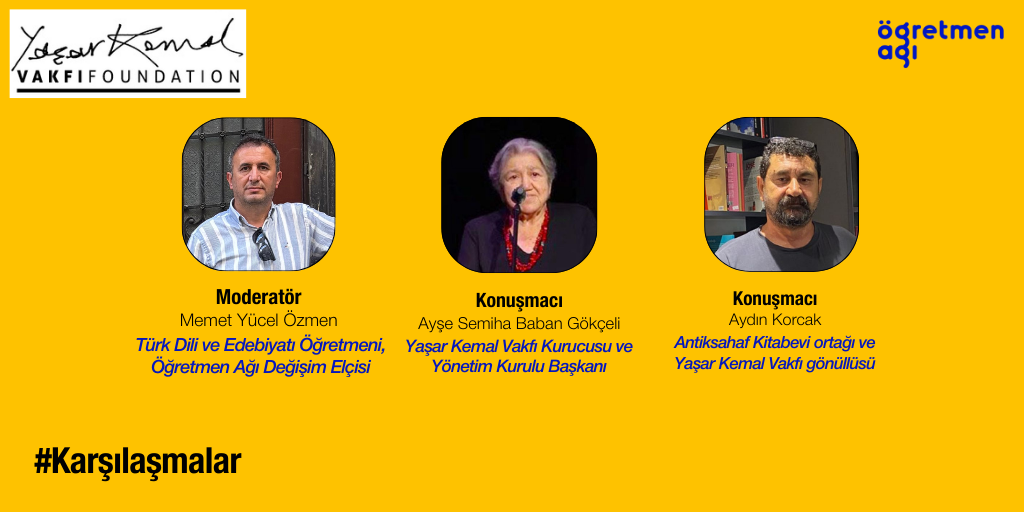 Eylül 18, 2025Saat: 20:00-21:30 Yaşar Kemal Vakfı İşbirliğiyle:18 Eylül Perşembe günü 20:00-21:30 saatleri arasında Zoom’da çevrimiçi olarak gerçekleşecek “Renkleriyle, Sesleriyle Çukurova ve Yaşar Kemal” etkinliğine davetlisiniz! Bu buluşmada, Türk edebiyatının en güçlü kalemlerinden biri olan Yaşar Kemal’in eserlerini, Çukurova’nın renklerini ve seslerini konuşacağımız etkinlikte; Öğretmen Ağı Değişim Elçisi Memet Yücel Özmen moderatör, Yaşar Kemal Vakfı Kurucusu ve Başkanı Ayşe…