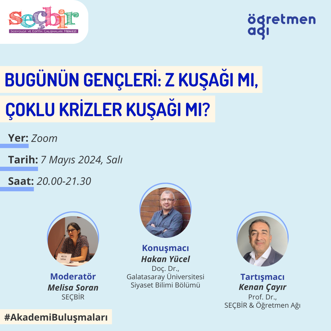Mayıs 7, 2024Saat: 20:00-21:30 SEÇBİR İşbirliğiyle:7 Mayıs Salı günü 20:00-21:30 saatleri arasında Zoom üzerinden çevrimiçi olarak gerçekleşecek “Bugünün gençleri: Z kuşağı mı, çoklu krizler kuşağı mı?” etkinliğine davetlisiniz! Günümüzde gençlerle ilgili hemen her şey “Z kuşağı” başlığı altına sıkıştırılıyor. Z kuşağı nitelemesi gençlerle ilgili açıklayamadığımız şeylere ışık tutan bir anahtar görevi görüyor: “Tabii bunlar Z kuşağı!” sözünü eğitim başta…