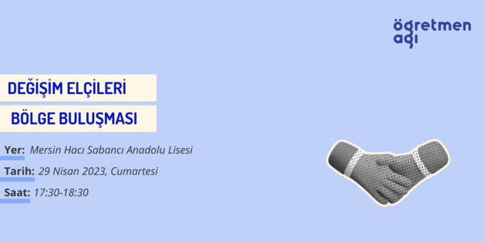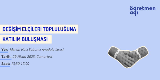 Nisan 29, 2023Saat: 13:30-17:00 Değişim Elçisi olmak isteyen öğretmenlere bir çağrımız var. Değişim Elçisi olarak Öğretmen Ağı’na katılmak isteyen tüm öğretmenleri, 29 Nisan Cumartesi günü, 13:30-17:00 saatleri arasında Mersin Hacı Sabancı Anadolu Lisesi’nde gerçekleştireceğimiz Değişim Elçileri Topluluğuna Katılım Buluşmasına davet ediyoruz. Değişim Elçileri, Öğretmen Ağı’nın peşinde olduğu değişim hedefini mümkün kılan öğretmenlerdir. Değişim Elçisi öğretmenler,…