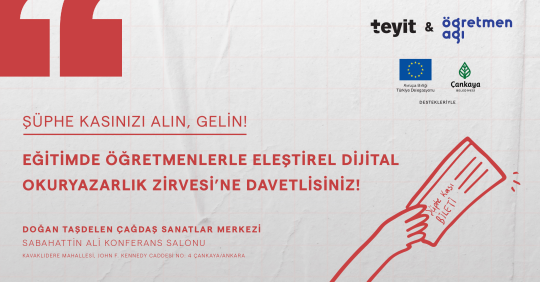 Haziran 11, 2022Saat: 13:00-17:00 Teyit İşbirliği; Avrupa Birliği Türkiye Delegasyonu ve Çankaya Belediyesi Desteğiyle: Salgınla birlikte hızla dijitale dönen dünya ve salgının getirdiği belirsizlikle sindiremeyeceğimiz kadar çok bilginin yığın halinde üzerimize gelmesi, eleştirel dijital okuryazarlık becerilerimizi hızla geliştirmemiz gerektiğini yeniden hatırlattı. Tüm bunları düşündüğümüzde, yaşadığımız çağın en önemli becerileri arasında "doğru" bilgiye ulaşmak,…