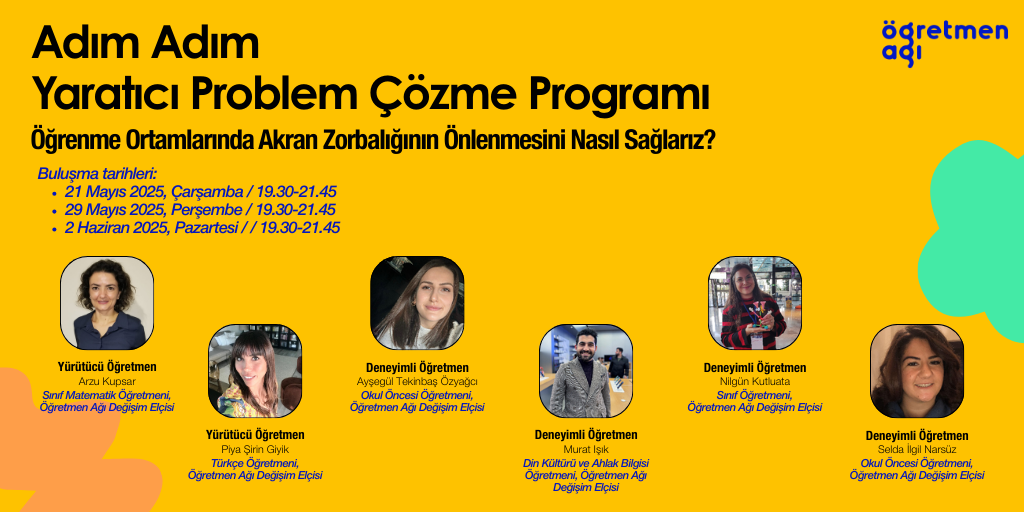 Mayıs 21-29, Haz 2 2025Saat: 19:30-21:45 21 Mayıs Çarşamba, 29 Mayıs Perşembe, 2 Haziran Pazartesi akşamları 19:30-21:45 saatleri arasında Zoom üzerinden çevrimiçi olarak gerçekleşecek gerçekleşecek Adım Adım Yaratıcı Problem Çözme Programı’na davetlisiniz!"Her gün karşılaştığımız problemleri yeni bir bakış açısıyla çözmek mümkün mü?” Yaratıcı Problem Çözme (YPÇ) Programı, ortak bir probleme çözüm üretmek üzere Tasarım Odaklı Düşünme metodolojisinden yararlanılan ve…