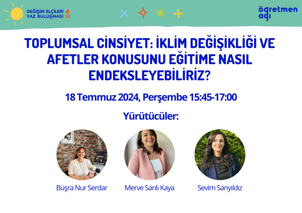 Bu atölye, toplumsal cinsiyetin iklim değişikliği ve afetlerle olan bağlantısı üzerine düşünmek ve bu konuyu eğitim ortamlarına taşımak için yeni bir yöntem arayanlar için tasarlandı. Son zamanlarda yaşadığımız deneyimler de bize gösterdi ki; iklim değişikliğinden ve afetlerden kadınlar ve çocuklar daha fazla etkileniyor, yardım kaynaklarına ve sağlık hizmetlerine erişimi daha sınırlı oluyor. Eğitimde bu konunun nasıl ele alınacağına dair beyin fırtınası yapacak ve bunu eğitime entegre etme sürecine dair fikirler üreteceğiz.