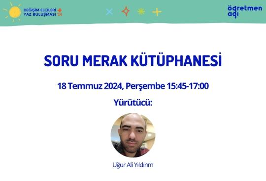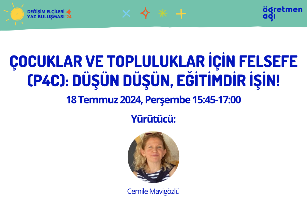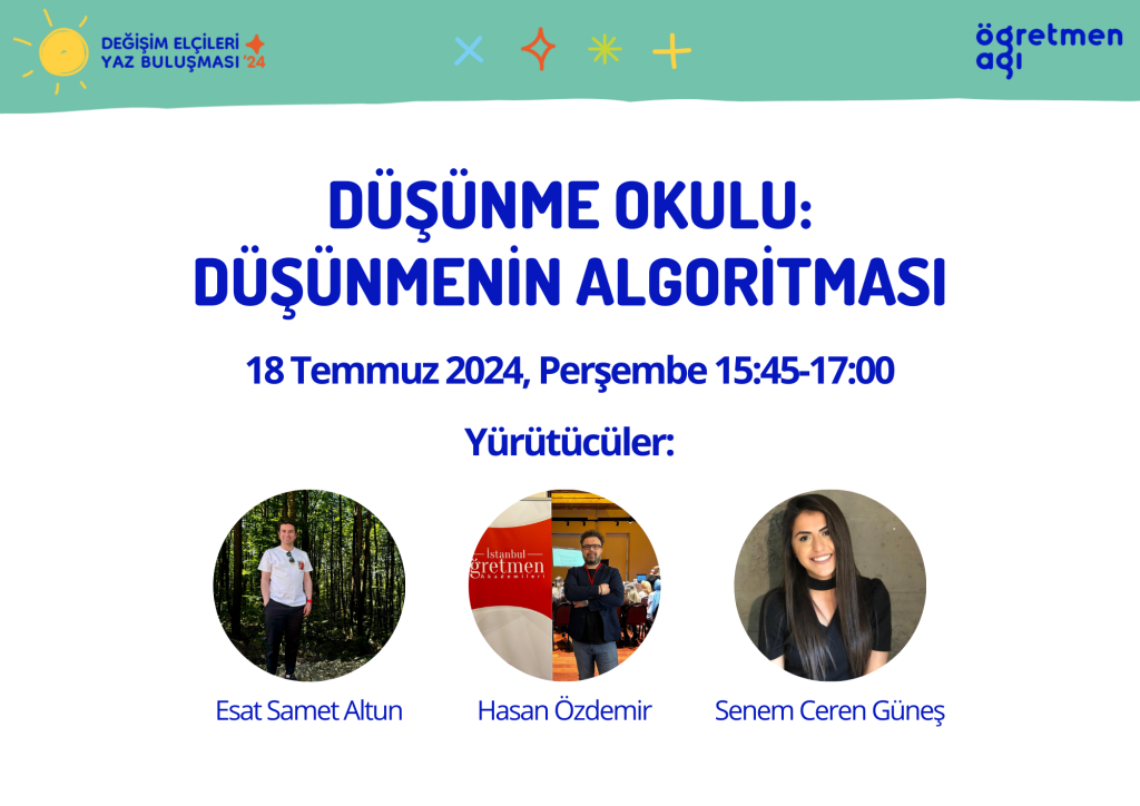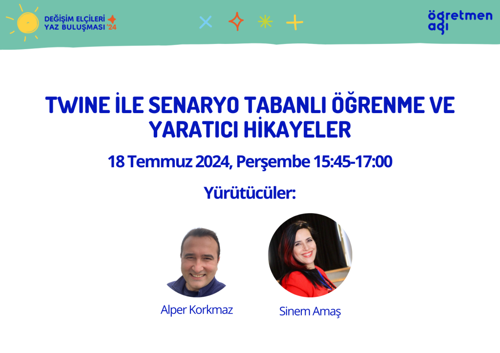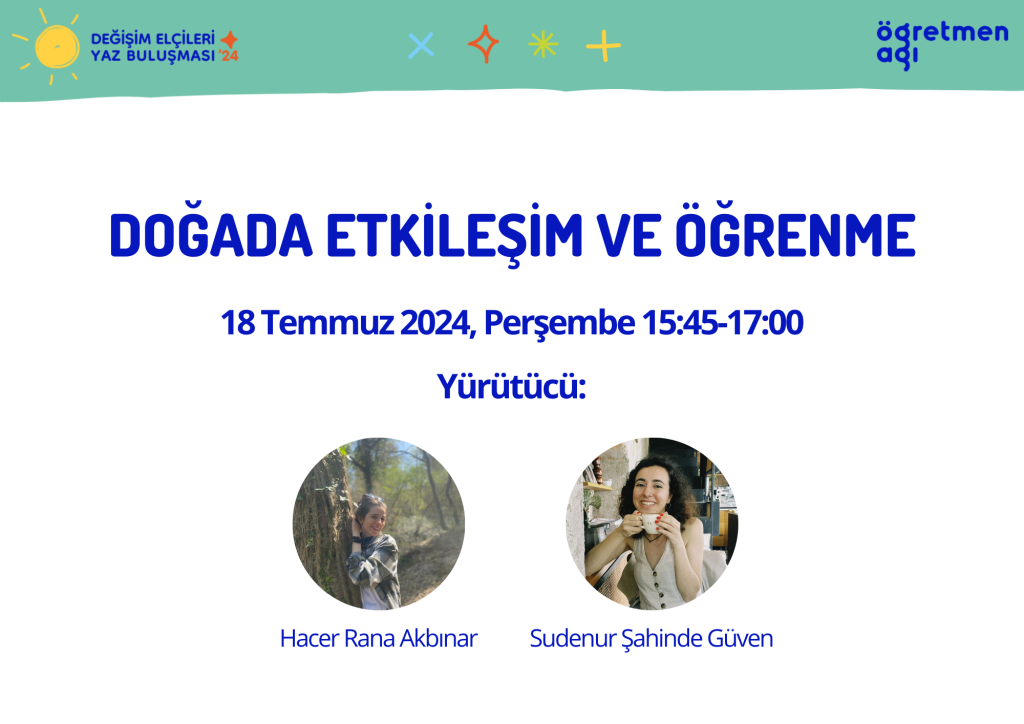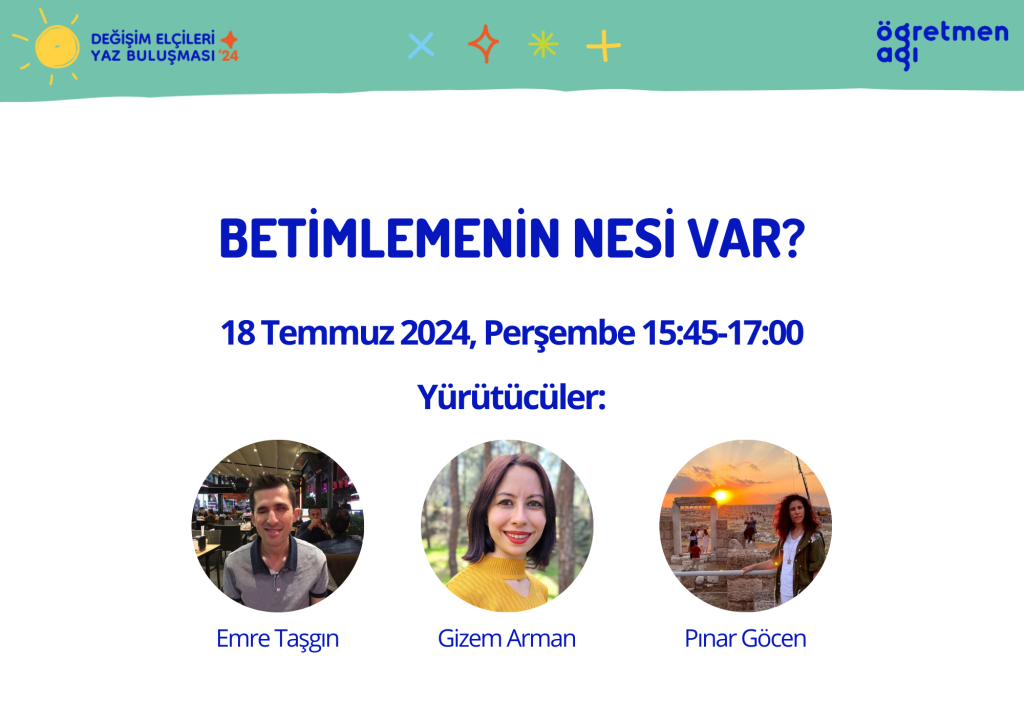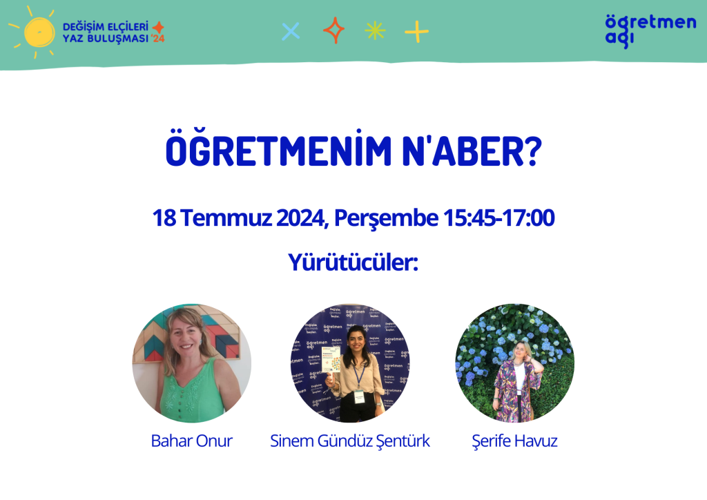 2024 Değişim Elçileri Yaz Buluşmasının teması: #YaşasınÖğretmenlik #ÖğretmenlikYaşasın. Bu yıl gücümüzün, etkimizin, değişimin ancak ve ancak öğretmenden başlayarak mümkün olduğunu bilerek #YaşasınÖğretmenlik #ÖğretmenlikYaşasın diyeceğimiz alanlardan biri de Öğretmenden Öğretmene Atölyeler. 18 Temmuz Perşembe günü 15:45-17:00 saatleri arasında gerçekleşecek. 12 eş zamanlı oturumdan sadece birine kayıt olmanızı rica ediyoruz.