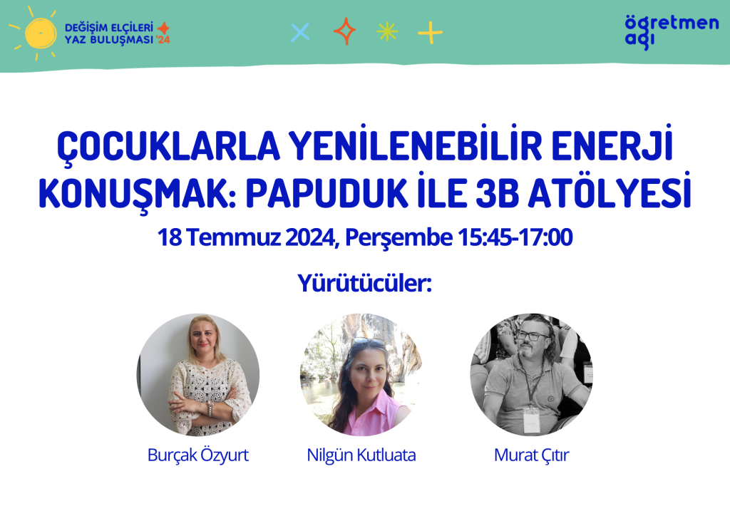 Bu atölyede; yenilenebilir enerji temasına dair, Sabancı Vakfı tarafından 7-9 yaş çocuklar için hazırlanan Papuduk çocuk kitapları ile tanışacak, 3B (beklenti oluşturma, bilgi inşa etme, birleştirme) metodolojisini tanıyacak ve iklim krizi konuşurken bu yeni metodolojiyi kullanarak öğrenci dahiliyetini ve katılımını nasıl sağlayabileceğimizi göreceğiz.