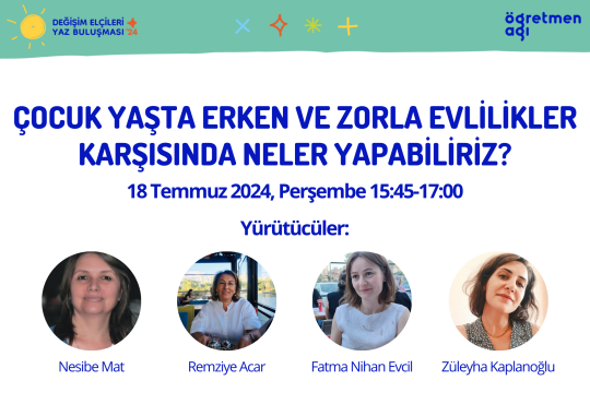 Bu atölye, ÇYEZE’yi önlemede öğretmenin rolünün neler olduğunu konuşmak için tasarlandı. Öğretmenler olarak çocuk yaşta erken ve zorla evlilikleri önlemek için neler yapabileceğimizi konuşacağız. Çocuk koruma kavramından bahsedecek, bu süreçte öğretmenlere düşen rollere bakacağız. Bunlarla birlikte, bu durumlarla karşılaştığımızda nerelere başvurabileceğimizi, kimlerden destek alabileceğimizi konuşacağız.